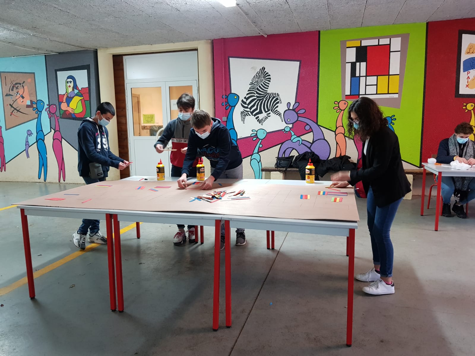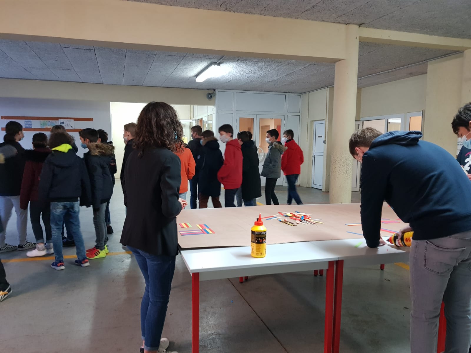 Vendredi 4 décembre 2020, l’établissement a organisé une action en faveur du Téléthon. Afin de respecter le protocole sanitaire, nous avons abandonné l’idée d’une course solidaire et nous avons mis en place un autre projet. A chaque don, une buchette colorée était donnée. Toutes rassemblées, elles ont été collées par des élèves de 3ème sur une plaque de contreplaqué afin de former le mot: ENSEMBLE (thème de l’année). La plaque sera vernie et installée sous le préau.
