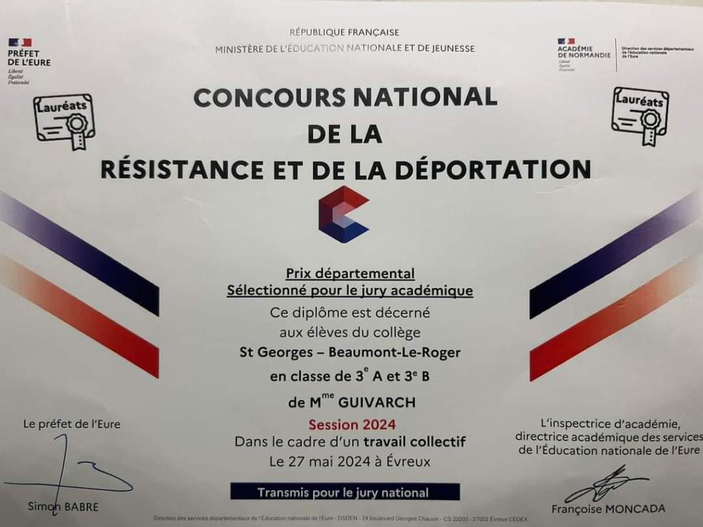 Les élèves de 3e et leur professeur madame Guivarch sont très fiers d’avoir reçu le prix départemental académique pour leurs travaux pour le concours national de la Résistance et de la Déportation. Un grand BRAVO !